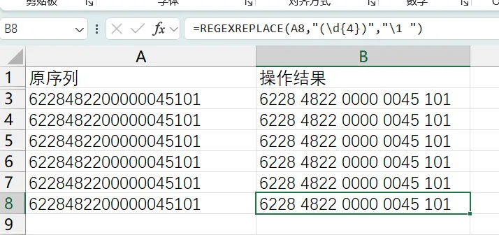 EXCEL新增加的函数中有正则表达式函数,熟悉正则表达式的同学来说,这个问题完全是小菜一碟。=REGEXREPLACE(A8,"(\d{4})","\1 ")以下是百度文心一言对这个公式的解释(懒得打字,AI生成的容有部分调整):"(\d{4})":正则表达式,匹配连续4位数字,并用括号()捕获为一个分组(记为\1)。"\1 ":替换内容,表示保留匹配到的4位数字(\1),并在后面加一个空格。