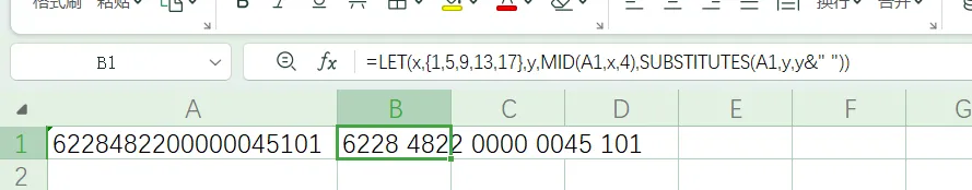 前面说到SUBSTITUTE函数,WPS在25年维护时新增了一个独有的SUBSTITUTES函数。英语中S表示复数,这里也可以理解为多次替换。利用这个函数,我们将原字符串中的每4位替换成它本身加一个空格,不就可以实现我们想要的结果么?=LET(x,{1,5,9,13,17},y,MID(A1,x,4),SUBSTITUTES(A1,y,y&" "))