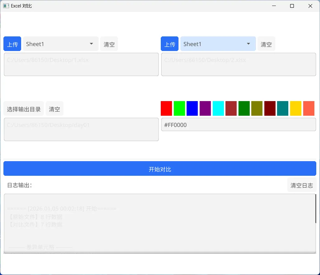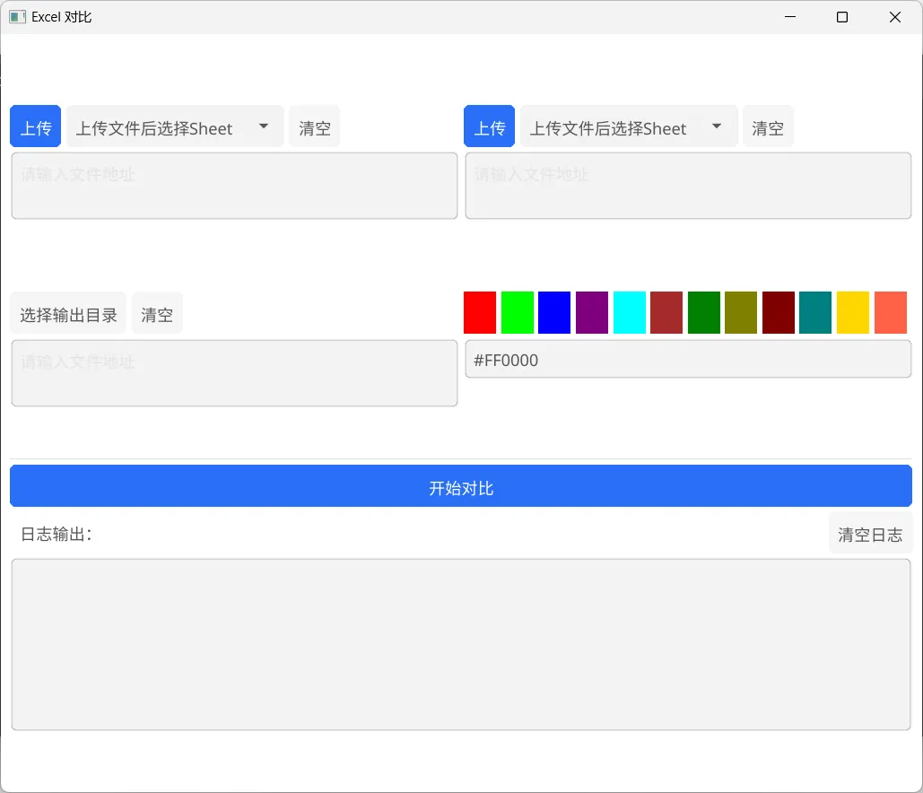 1.首先点击选择输出目录选择输出路径,然后点击左边上传按钮,导入要比对的第一个Excel文件;再点击右边上传,导入第二个文件。