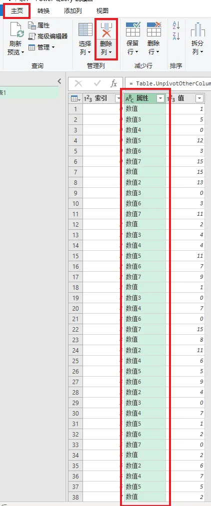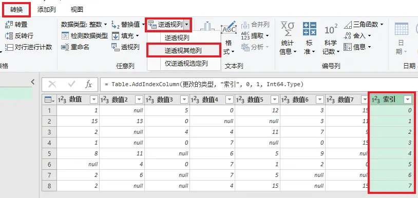 4. 选中“索引”列 --> 选择任务栏的“转换”-->“逆透视列”-->“逆透视其他列”