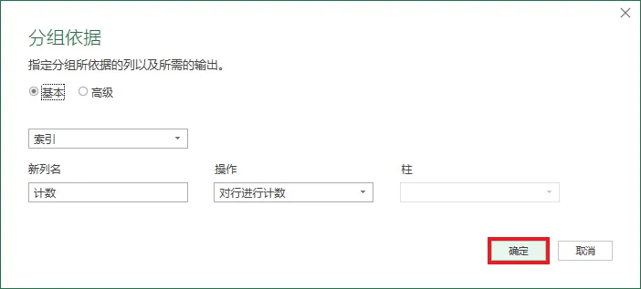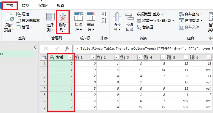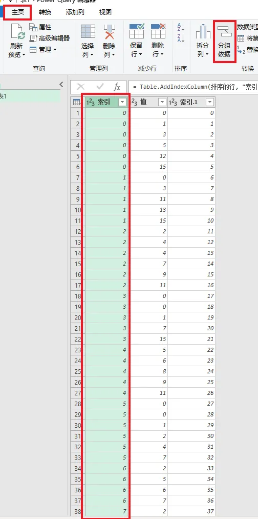 8. 选中“索引”列 --> 选择任务栏的“主页”-->“分组依据”