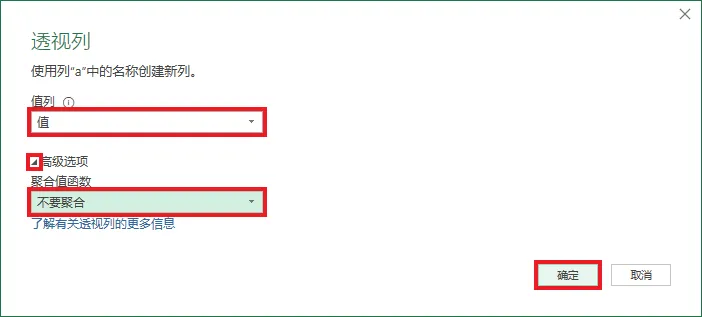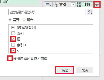 11. 展开“计数”列 --> 仅勾选“值”和“a”列 --> 取消勾选“使用原始列名作为前缀”--> 点击“确定”