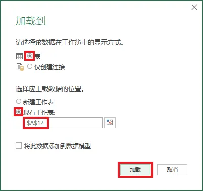 16. 在弹出的对话框中选择“表”--> 选择“现有工作表”及所需上传至的位置 --> 点击“加载”