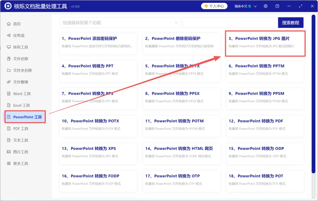 1、打开【核烁文档批量处理工具】,选择【PowerPoint工具】-【PowerPoint转换为JPG图片】。