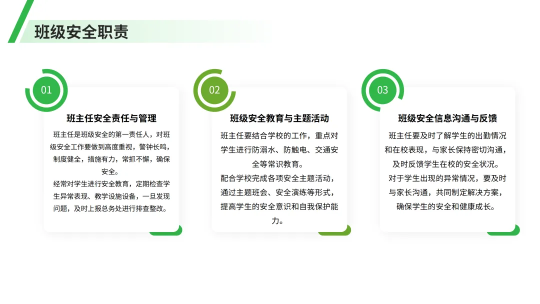 班主任是班级安全的第一责任人,对班级安全工作要做到高度重视,警钟长鸣。要建立健全班级安全管理制度,制定切实可行的安全措施,确保班级安全工作常抓不懈。要经常对学生进行安全教育,定期检查学生的异常表现和教学设施设备,一旦发现问题,及时上报总务处进行排查整改。