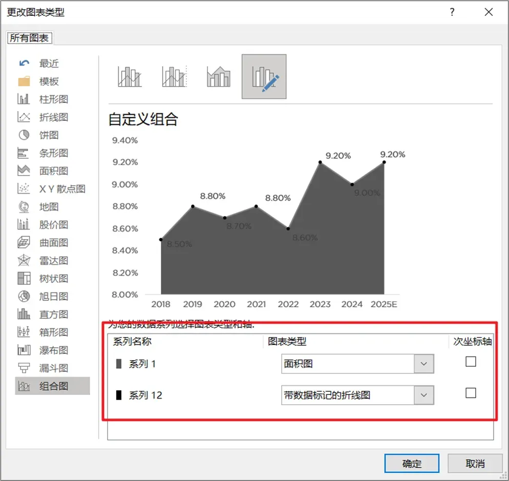 接着选中图表,右键点击【更改系列图表类型】,将图表类型分别设置为“折线图”和“面积图”。