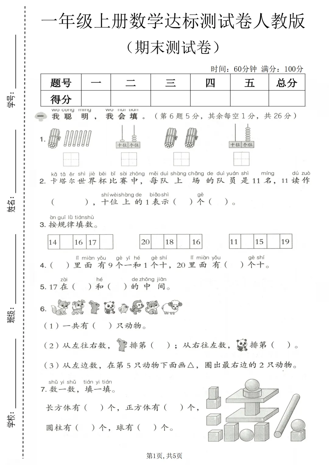 这份人教版一年级上册数学期末测试卷,考试时长 60 分钟,满分 100 分。试卷题型丰富,涵盖填空、计算、选择、画图、看图列式及解决问题等模块,全面考查学生基础运算、数感、规律探索及实际应用能力。填空题侧重数的读写、组成与规律,计算题含口算、加减混合及等式填空,解决问题贴近生活场景。整体难度适中,注重基础知识与实际应用结合,能有效检测学生学期学习成果。一年级上册数学期末测试卷(人教版)答案及重点题解析