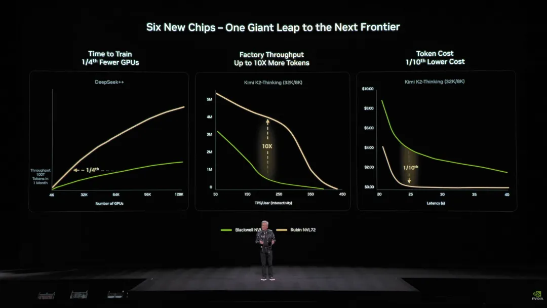 还有一点,在展示的新一代Rubin芯片架构时,老黄直接把Kimi K2 Thinking和 Deepseek 当作benchmark,证明Rubin 架构可以让 AI 的训练更省钱、推理更快、成本更低。