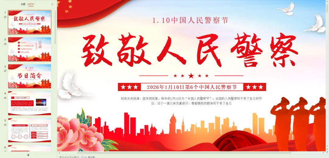 首先,我们来认识一个专门属于警察叔叔阿姨的节日—— 中国人民警察节。同学们知道吗?在我国,以职业命名的节日只有 4 个,分别是教师节、护士节、记者节,还有就是我们今天要重点了解的警察节。这个节日定在每年的 1 月 10 日,是国家专门为警察队伍设立的节日,这不仅是对警察工作的认可,更是对他们默默奉献的致敬。在这一天,我们可以向身边的警察叔叔阿姨说一声 “辛苦了”,感谢他们的守护。
