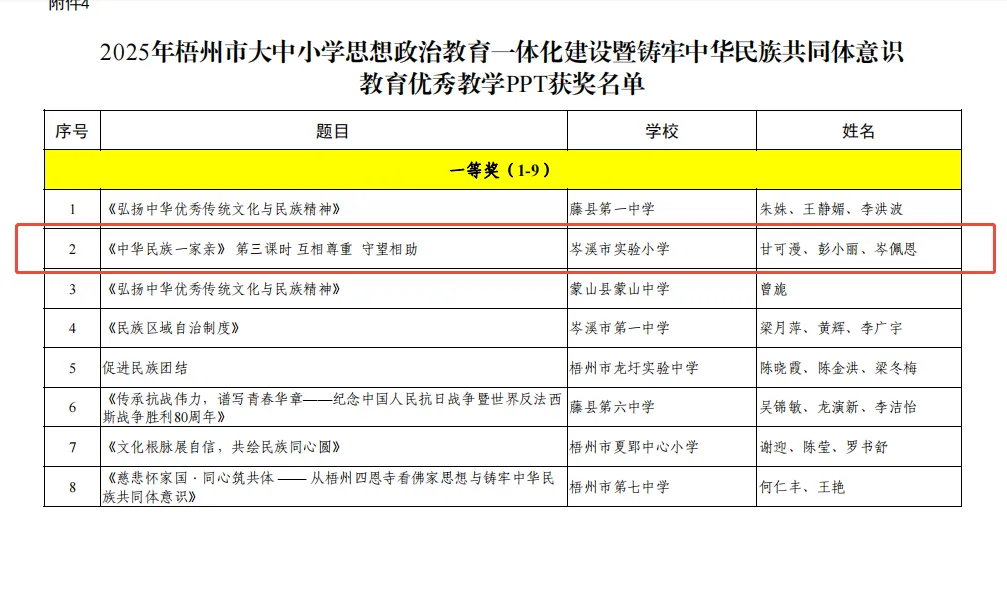 梧州市委教育工委近日印发《关于公布 2025 年梧州市大中小学思政一体化建设优秀工作案例、优秀论文、优秀教案、优秀教学 PPT 评选结果的通知》(梧教工委〔2025〕8 号),我校传来喜讯:
