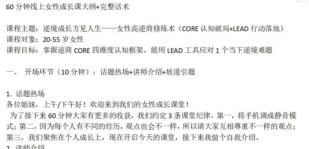 - 结尾话术:总结课程核心内容,升华逆商价值,预告后续成长计划,实现学员留存。