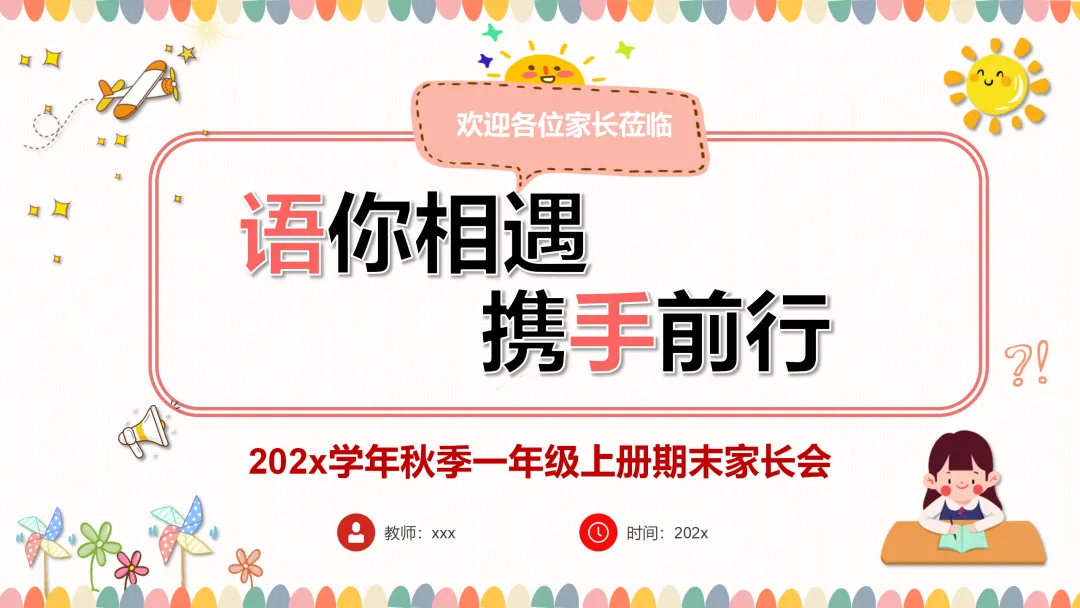 很高兴在这与您相遇,如果您是一位班主任老师,每天除了应对繁重的教学工作,还要加班整理班级、教务、教研、课件PPT资料,请关注下方的“小雨教务资料”,让我们风雨同路、一起成长~今天分享的是一年级语文秋季上期末家长会的ppt课件和发言稿,主题是《语你相遇,携手前行》
