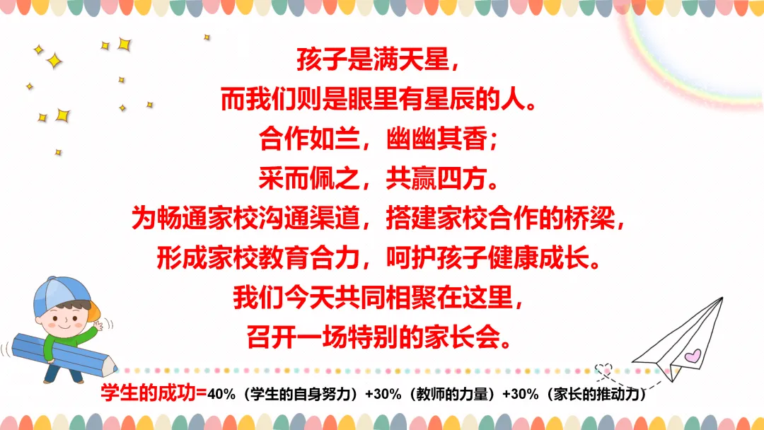 孩子是满天星,而我们则是眼里有星辰的人。合作如兰,幽幽其香;采而佩之,共赢四方。为畅通家校沟通渠道,搭建家校合作的桥梁,形成家校教育合力,呵护孩子健康成长。我们今天共同相聚在这里,召开一场特别的家长会。