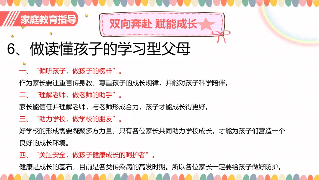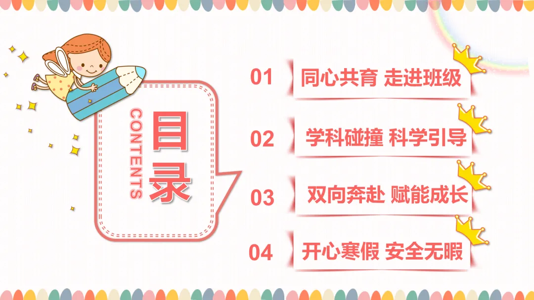 本次家长会分为4个小点进行:同心共育走进班级;学科碰撞科学引导;双向奔赴赋能成长;开心寒假安全无暇。