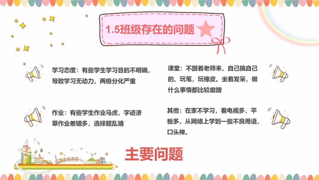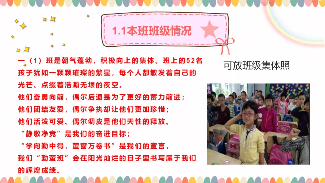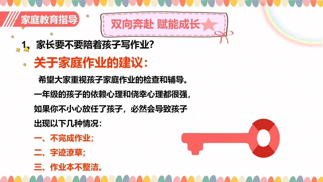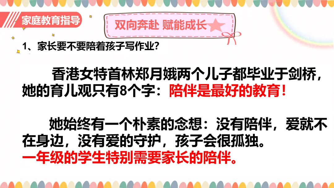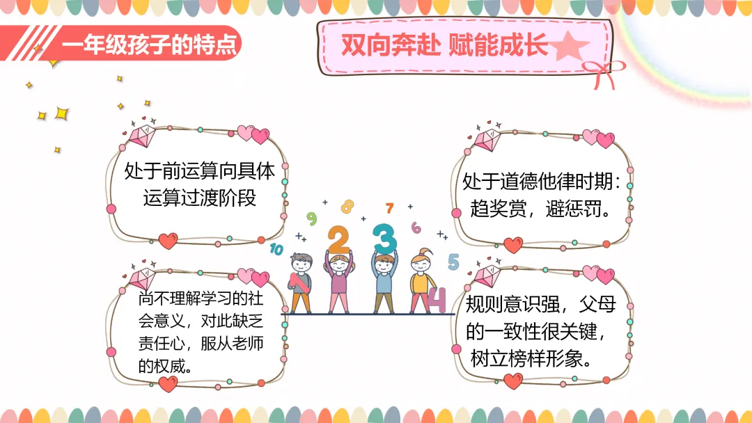 一年级孩子的特点:处于前运算向具体,运算过渡阶段;处于道德他律时期,趋奖赏,避惩罚;尚不理解学习的社会意义,对此缺乏责任心,服从老师的权威;规则意识强,父母的一致性很关键,树立榜样形象。