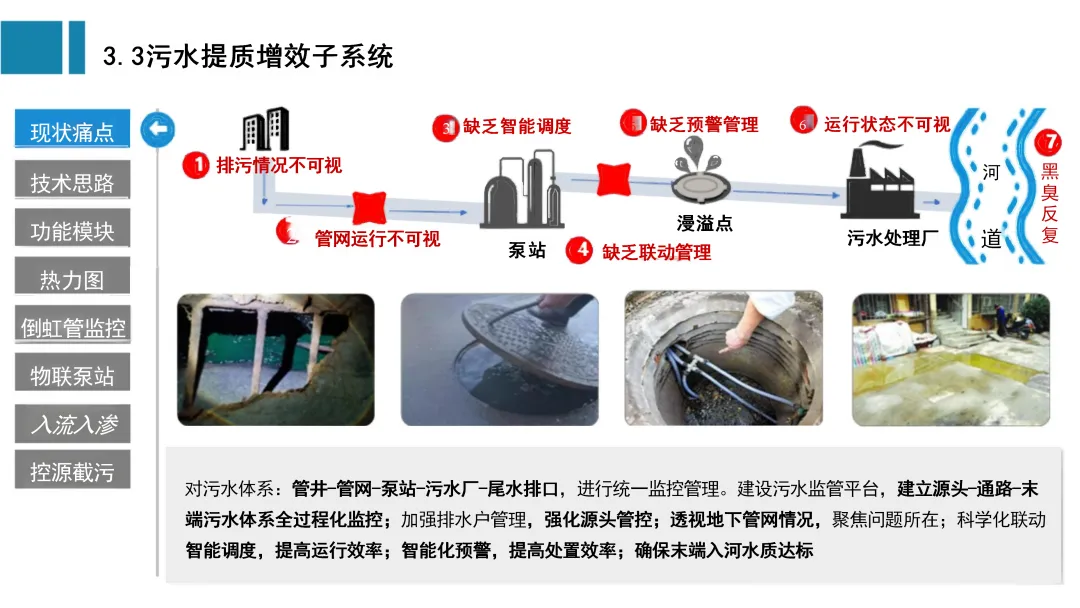本方案针对城市水环境治理中的关键问题,提出了智慧排水提质增效厂站网河一体化的解决方案。面对政府投入大但成效不显著、河道黑臭反复、管道质量差及污水处理效益低等挑战,方案创新性地运用物联网技术、大数据和人工智能等先进技术手段,构建全新的水环境治理体系。
