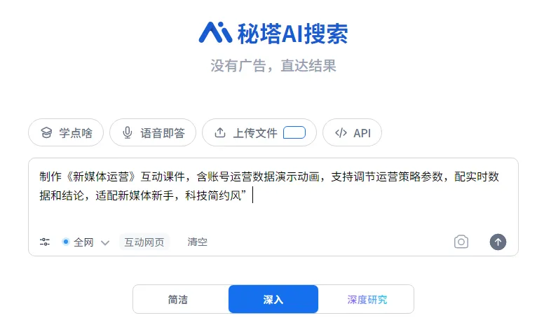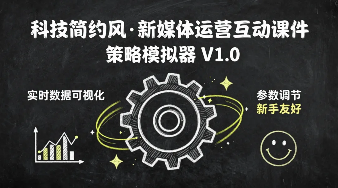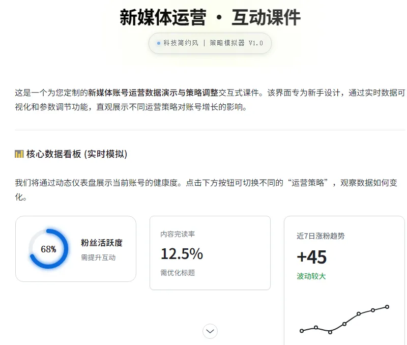 - 首页输入精准提示词,比如“制作《新媒体运营》互动课件,含账号运营数据演示动画,支持调节运营策略参数,配实时数据和结论,适配新媒体新手,科技简约风”;