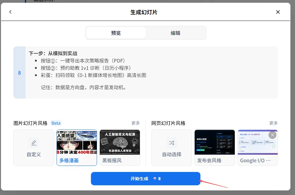 - 输入提示词(越具体越好),比如“制作《新媒体营销》漫画风格PPT”;