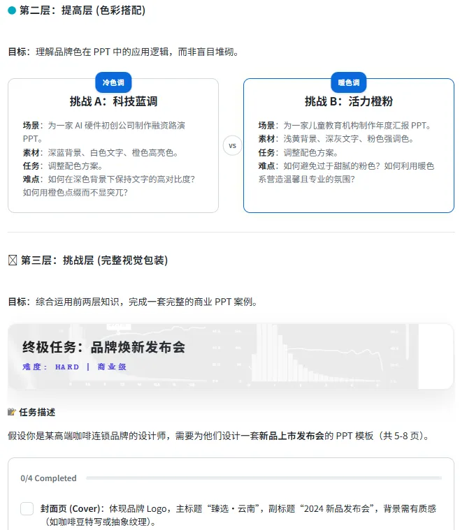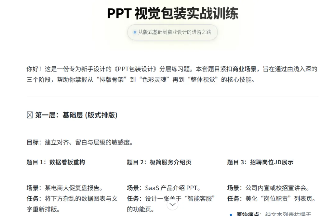 首页输入明确提示词即可,比如“为PPT新手《PPT包装设计》生成三层练习题:基础层3道版式排版设计、提高层2道色彩搭配题、挑战层1道完整PPT视觉包装设计,题目贴近商业场景,附设计思路”,工具获取方式