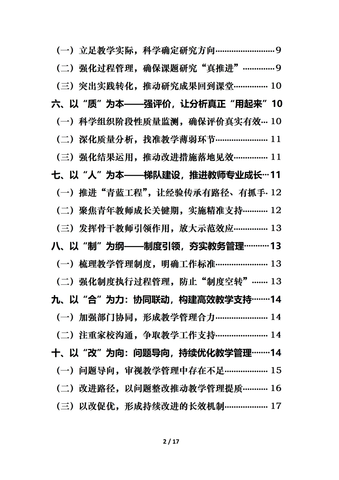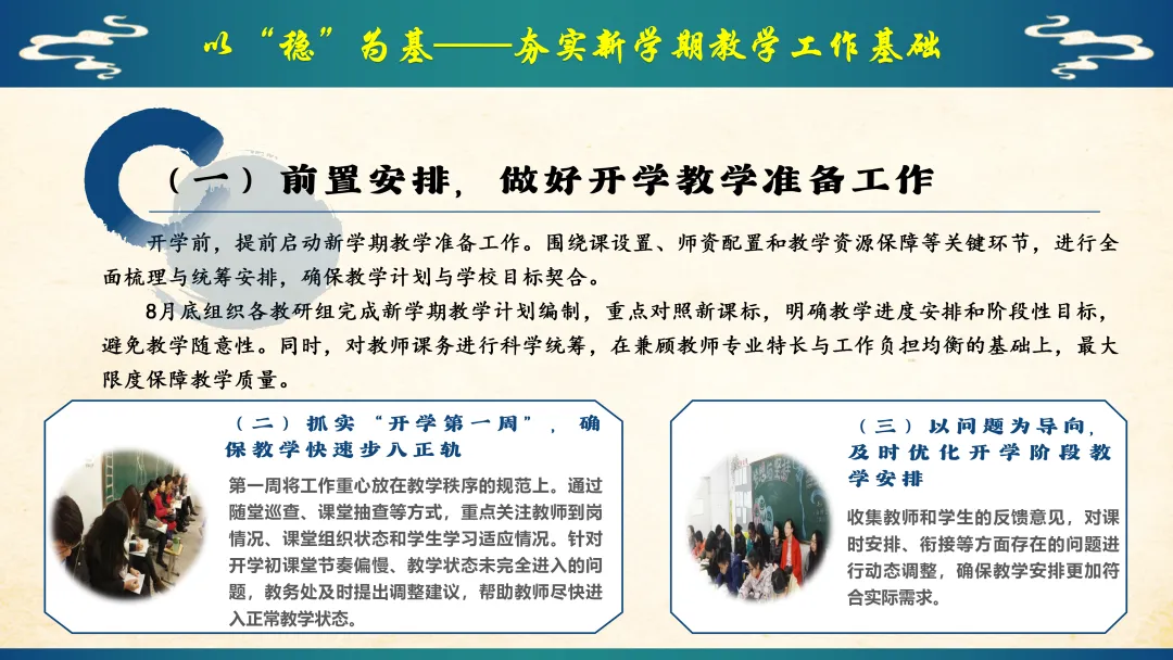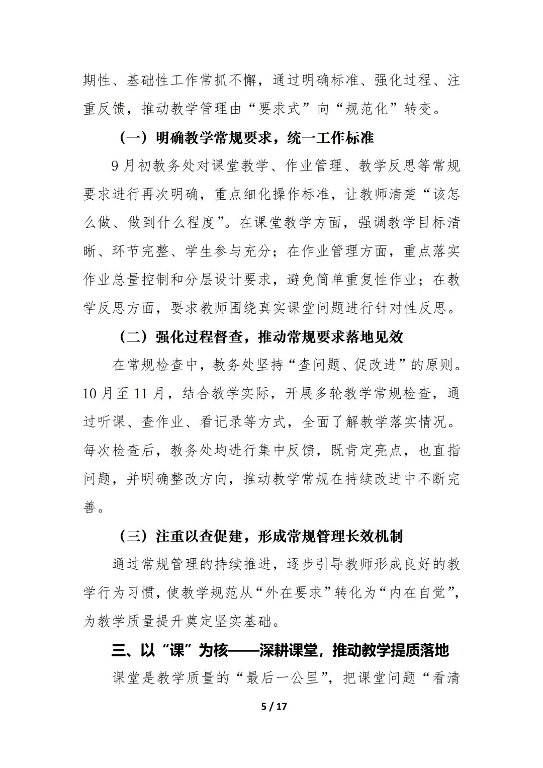 教学高质量提升,关键在落实,落点在课堂。2025年秋季学期在新课标背景下,进一步聚焦课堂质量、深化教学改革、夯实教学管理基础,坚持以课堂教学为中心,以教学常规管理为抓手,以教研活动和质量监测为支点,围绕“强常规、改课堂、促教研、提质量”的工作思路,推进各项教学工作落地落实。