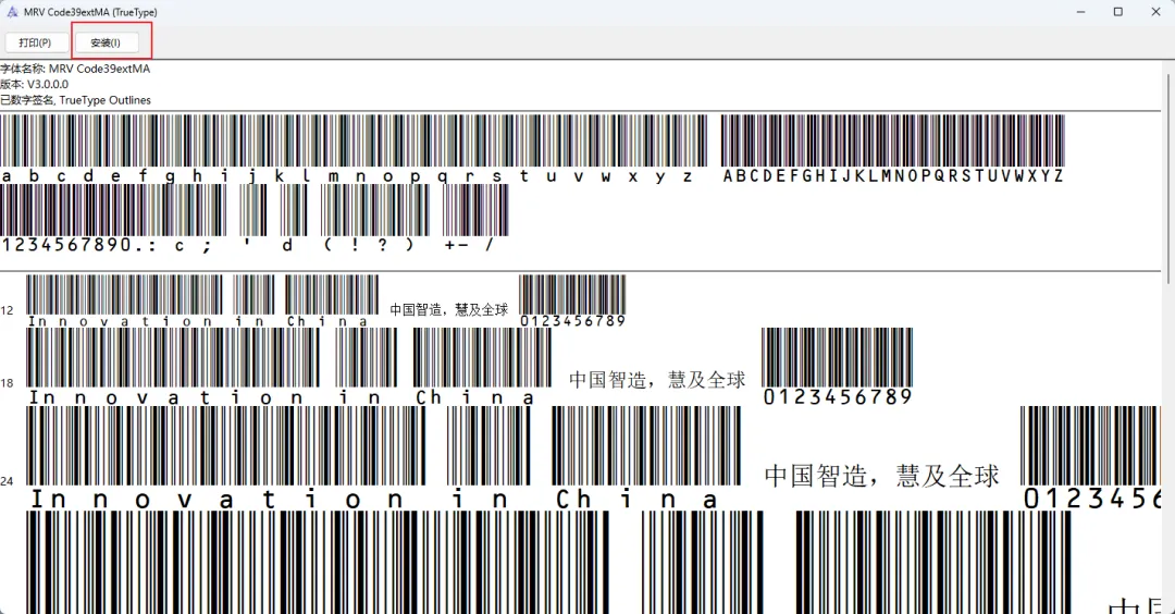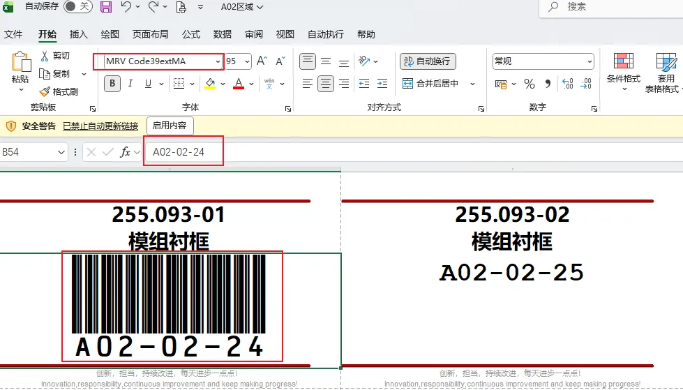 下载好后进行安装,注意要先关闭已经打开的Excel,再次开启才能看到。将需要生产条码的单元格(确保原始数据设置为文本格式)字体改为Code 39每个 Code 39 - Regular 字符由 9 个元素表示:5 个条形和 4 个空格,其中 3 个宽和 6 个窄。(名称“Code 39”最初是“Code 3 of 9”,其来源是每个 Code 39 字符的 9 个元素中有 3 个始终是宽的。如A02-02-24,要写成*A02-02-24*