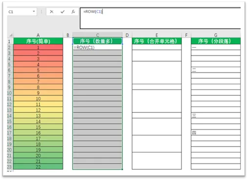 在单元格输入“=ROW(C1)”,按下“Ctrl+Enter”,就完成了序列填充。