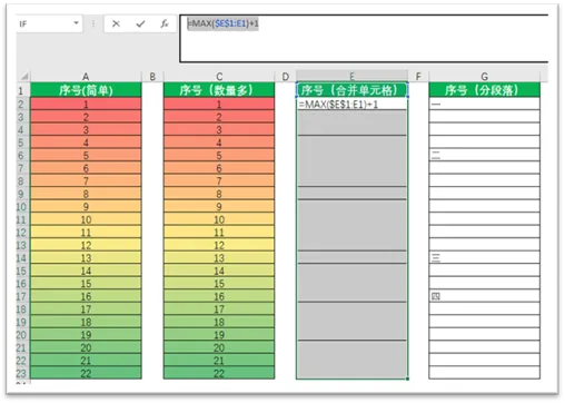 对于需要填充的数列中有合并单元格的,首先选中需要填充的单元格,在单元格中输入“=MAX($E$1:E1)+1”,按下“Ctrl+Enter”,就能完成序列填充。