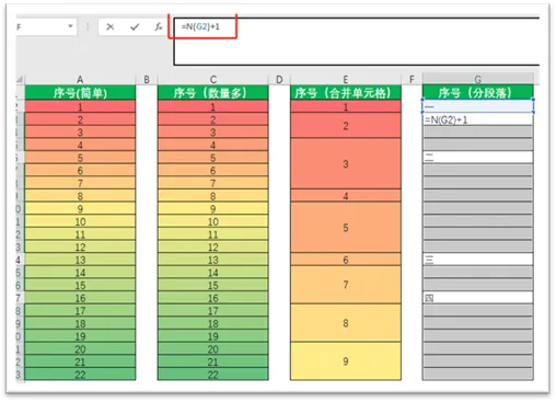 在定位好的单元格中输入“=N(G2)+1”, 按下“Ctrl+Enter”,就能完成序列填充。