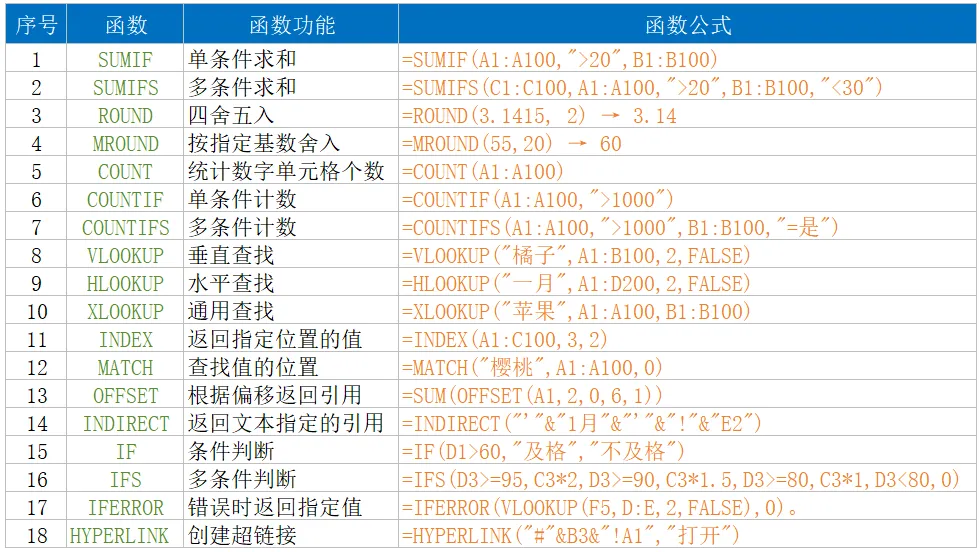 小结:常用的18个函数给大家总结成了以下图,可收藏用时查阅。