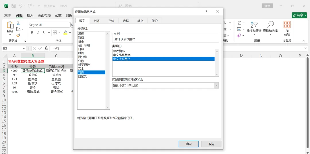 其实在Excel中有提供数字转大写的功能,通过【设置单元格格式】选择【特殊】,在【类型】设置为“中文大写数字”;或者通过输入公式=TEXT(A3,"[DBNum2]") ,但是,最终显示的结果根本不符合国人的习惯和标准,下面分享两种方法供借鉴:方法一:Excel万能公式(网上大佬分享的,在此就借花献佛啦)整数、小数、负数全适配,直接生成规范财务大写金额,高效避坑。=IF(A3<0,"负","")&TEXT(INT(ABS(A3)),"[dbnum2]")&TEXT(MOD(ABS(A3),1)/1%,"[>0][dbnum2]元0角0分;[=0]元整")