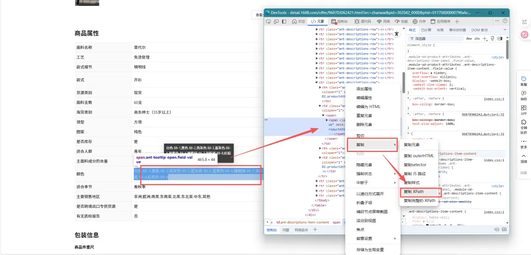 2. 在开发者工具的代码区域,找到对应商品名称的代码行,右键选择“复制-复制XPath”;