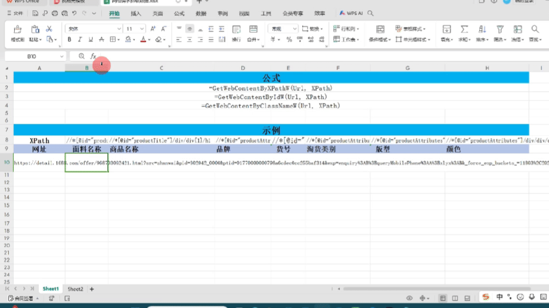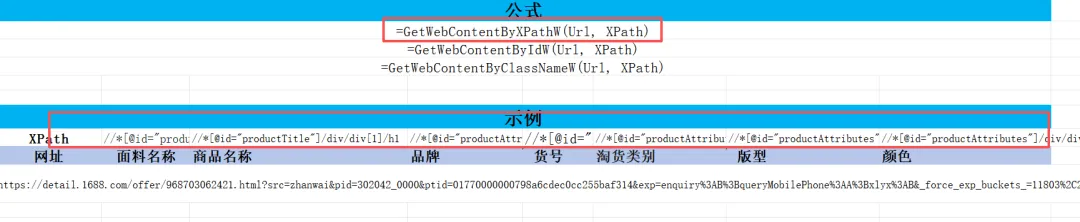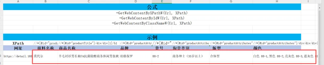 1. 输入公式:=GetWebContentByXPath(URL, "商品某信息的XPath"),按下回车;