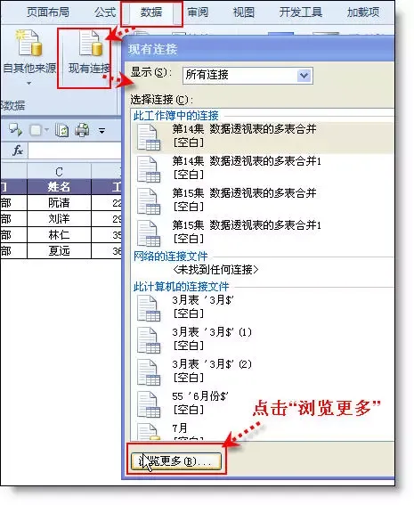 1、数据选项卡 - 现有连接 - 浏览更多。
