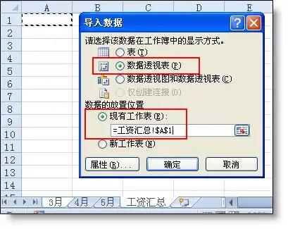 4、【导入数据】窗口中,显示方式选“数据透视表”,放置位置选工资表A1单元格(也可以选新工作表)