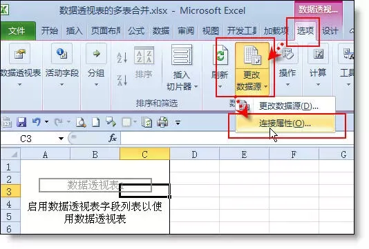 5、选取刚创建的数据透视表,然后点击 数据透视表工具 - 选项 - 更改数据源 - 连接属性。