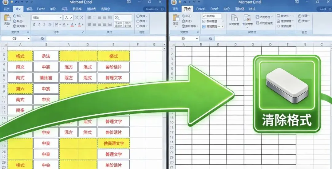- 操作步骤:选中需要清理格式的单元格区域,点击【开始】选项卡中的【清除】按钮下拉箭头;选择【清除格式】选项,所有的字体样式、背景色、边框、条件格式等会被一键清除,只保留单元格内容,表格秒变清爽!