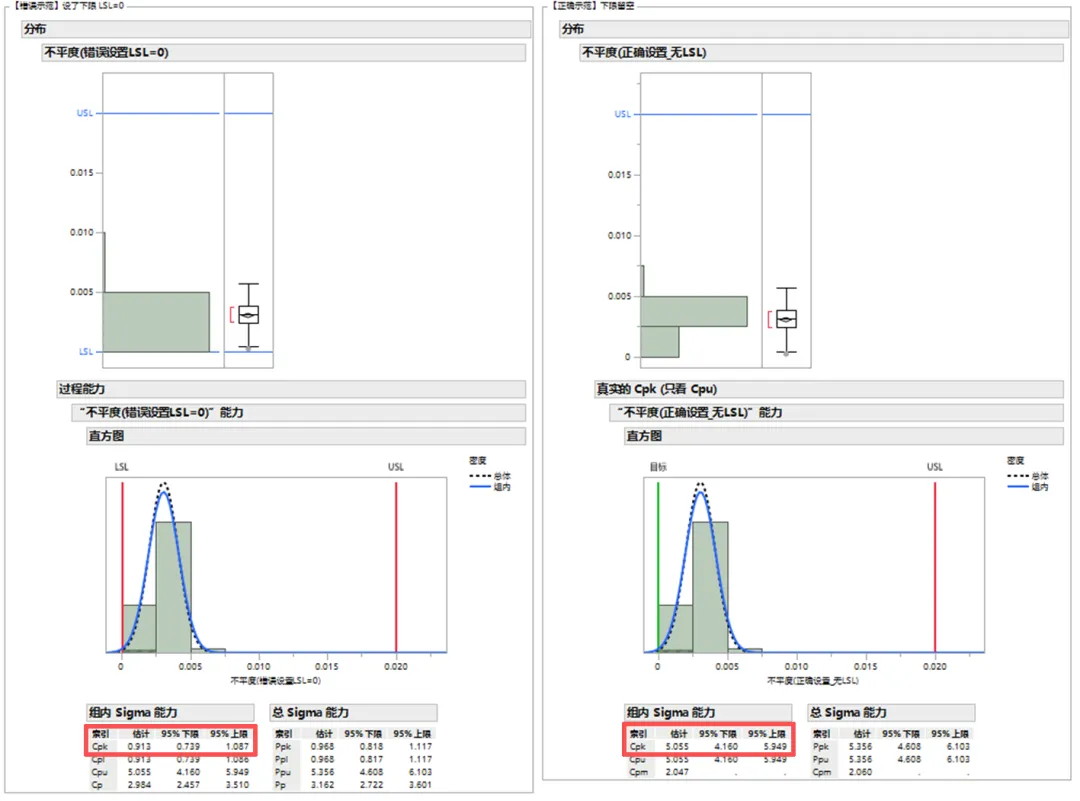 JMP发现你的数据离下限(0)非常近,判定:“哎呀,你的数据这就快要超下限了,这很危险啊!” 于是它算出了一个极低的 $Cpl$,直接拉低了最终的Cpk。
