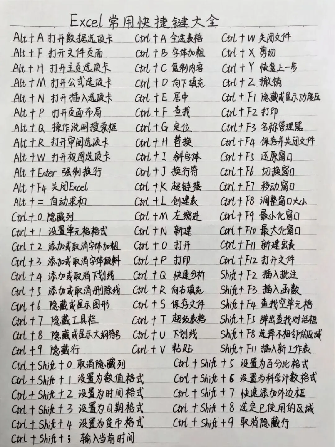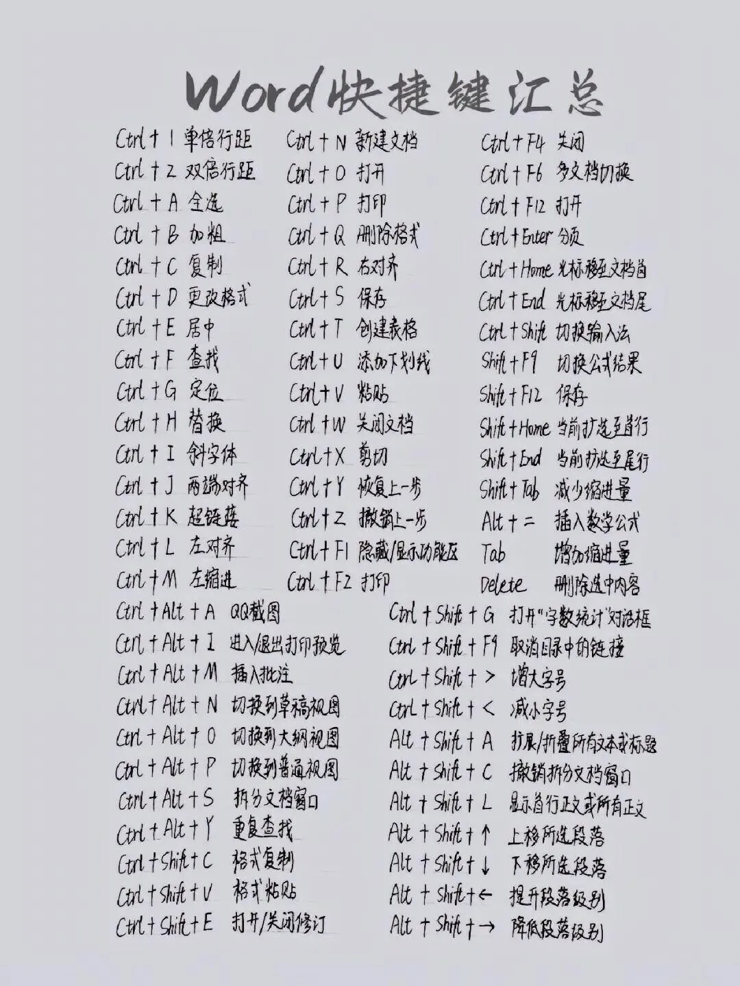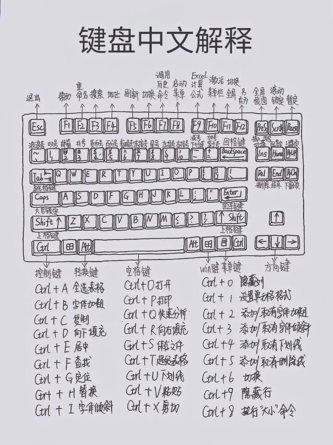朋友们,你们有没有过这种时刻?对着 Word 改格式半天找不着按钮,用 Excel 算数据点鼠标点到手腕酸,明明是简单的操作,却因为记不住快捷键白白浪费时间😭今天我专门把自己私藏的电脑快捷键,以及 Word 和 Excel 常用快捷键整理出来了,还有键盘按键的中文注解,你们要是再遇到这种情况,直接来我这儿翻就行!我整理的这些里主要有三类干货,首先是 Word 的常用快捷键,像 Ctrl+A 全选、Ctrl+E 居中这些基础款就不说了,Ctrl+T 能一键建表格,Ctrl+Shift+G 还能打开字数统计,写文案查字数超方便;然后是 Excel 的快捷键,Alt+= 自动求和谁用谁知道,Ctrl+D 向下填充能省超多事,Shift+F11 插新工作表也是职场人必备;最后还画了键盘按键的解释图,F 键区、功能键的用途标得清清楚楚,新手也能一眼看明白。其实这些快捷键都不难记,平时办公时多试几次就熟了,我现在敲文档基本都不用鼠标,速度快了不止一倍。而且我整理的都是日常办公最常用到的,没有那些花里胡哨用不上的,纯纯的实用干货!你们平时办公有没有自己的压箱底快捷键?评论区分享一下,咱们互相抄抄作业,一起把办公效率拉满~
