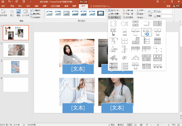 那么我们要如何在PPT里快速排版呢?如果你实在没有一些好的创意,或者很赶时间的话,那么你可以试试这个排版方法,选中图片,点击【格式】——【版式】,选择任意一个你喜欢的样式,一秒做出高大上的排版~