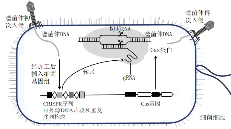 结肠癌细胞以及正常结肠细胞死亡后会将其DNA释放至肠腔中。为进一步获得能够区分突变K基因和正常K基因的B菌,需对其进行优化。B菌中天然存在用于防御噬菌体的CRISPR/Cas系统。CRISPR/Cas系统由Cas蛋白与gRNA构成,其工作原理如图2。目标DNA被Cas蛋白切断后,会在细菌细胞中被降解。研究者利用这一机制,构建相关重组DNA并导入B菌,获得B2菌。B2菌仅在捕获突变K基因后才能在含有卡那霉素的平板上存活。