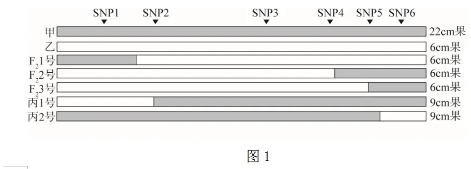 (3)单核苷酸多态性(SNP)是不同DNA分子上稳定的遗传标记。研究者对F2中部分6cm果个体和丙中部分个体进行SNP检测,发现2号染色体上SNP情况如图1。推测使果长由6cm增加为9cm的突变位点位于_______之间的区域,进一步研究发现该突变基因为SF1基因。
