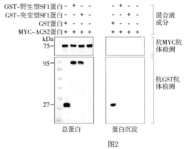 (4)丙植株在果实早期发育阶段乙烯产量和乙烯合成关键酶ACS2的量均显著低于乙,乙烯有抑制细胞分裂的作用。SF1基因编码一种促进其他蛋白降解的酶。为研究SF1蛋白能否与ACS2互作,研究者制备GST蛋白、GST-野生型SF1蛋白、 GST-突变型SF1蛋白,分别与磁珠偶联,再分别与表达MYC-ACS2融合蛋白的细胞裂解液混合温育,随后对混合液总蛋白和磁珠沉降后的蛋白沉淀进行电泳和抗体检测,结果如图2,表明野生型和突变型SF1蛋白都能与ACS2发生结合。请在图2中补充画出蛋白沉淀检测结果中其他泳道的条带。