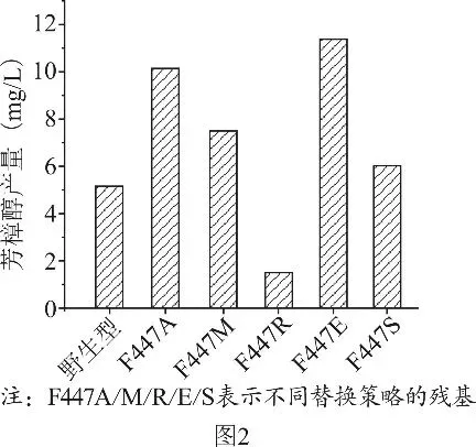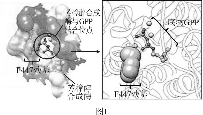 (2)为提高芳樟醇合成酶催化GPP的效率,科研人员对该酶的关键氨基酸残基(即多肽中的氨基酸单位)进行分析,结果如图1。推测芳樟醇合成酶F447残基具有疏水性及较大的空间位阻,可能阻碍GPP与芳樟醇合成酶活性位点的结合。支持以上推测的证据有__________。