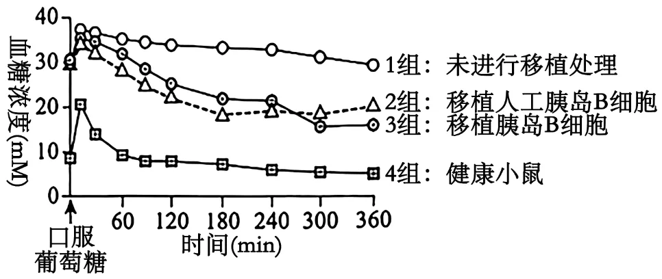 8. 科研人员通过细胞改造制造出人工胰岛B细胞,移植到糖尿病模型鼠腹腔内。一段时间后检测其血糖浓度,如下图。下列叙述正确的是( )