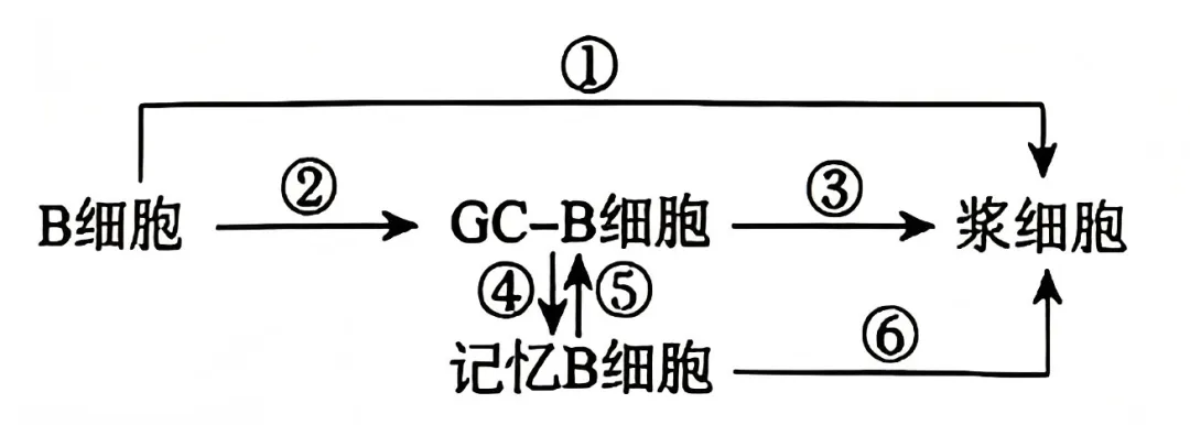 9. 浆细胞和GC-B细胞均由B细胞分化而来,参与分化过程的重要物质分别为P和H。两类细胞对机体防御流感病毒、HIV等高度变异病毒的侵染具有重要作用。下图为该类免疫过程中B细胞的分化过程,下列相关叙述错误的是( )