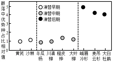 11. 十九世纪中期以来,青藏高原东缘的海螺沟冰川不断退缩,在退缩区上形成了一个完整且连续的植被演替序列。图示为连续调查结果,显示演替不同阶段该地优势种的变化。下列相关叙述错误的是( )