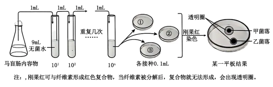12. 从马盲肠中分离出能够降解纤维素的厌氧细菌并对其进行鉴定,实验流程和结果如下图。下列叙述错误的是( )