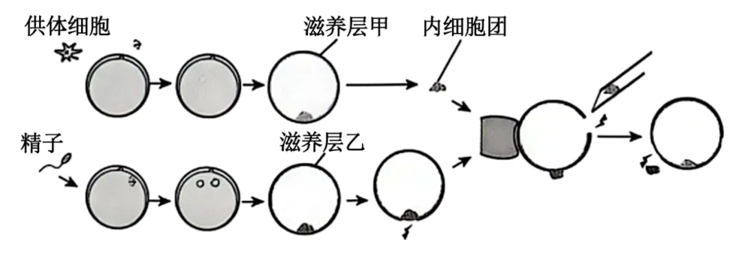 【详解】A、图示将甲的内细胞团注入到乙的去内细胞团胚胎中,培养过程涉及到体外受精、动物细胞培养和显微注射等技术,A正确;
