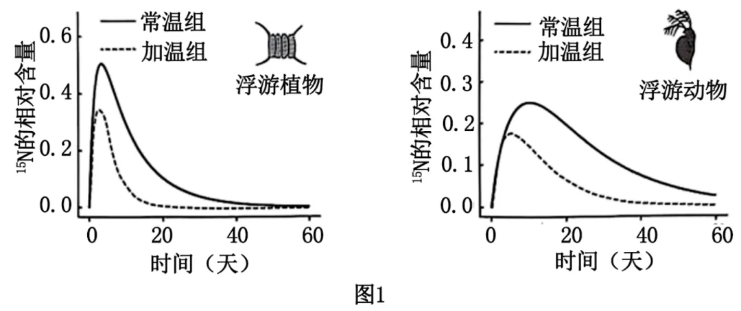 ①图1显示,与常温组相比,加温组浮游动植物体内15N相对含量___________。