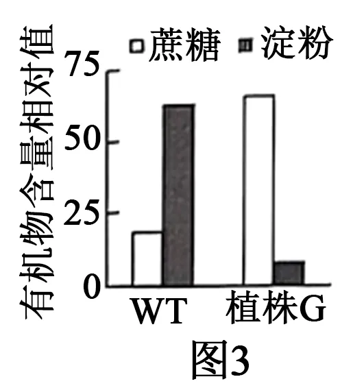 已知蔗糖通过韧皮部运输至花粉后转化为淀粉,进而形成淀粉粒,据图可知,植株G花粉中蔗糖含量明显高于WT,说明不是蔗糖运输障碍导致的。因此图3结果不支持科研人员的推测。